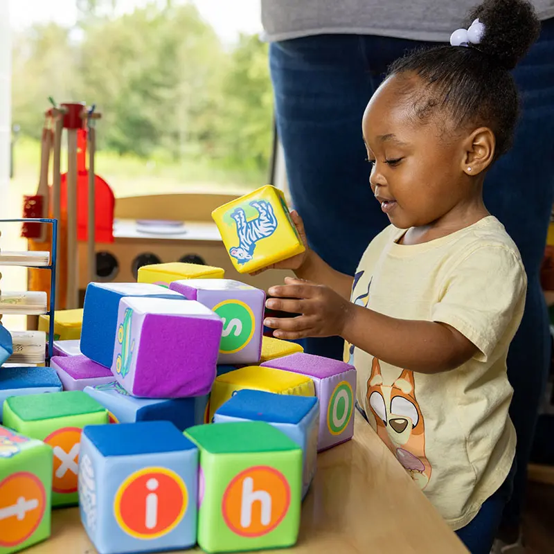 In South Carolina, 2-year-old Bella plays with building blocks inside a mobile classroom — a lifeline for kids growing up in poverty.